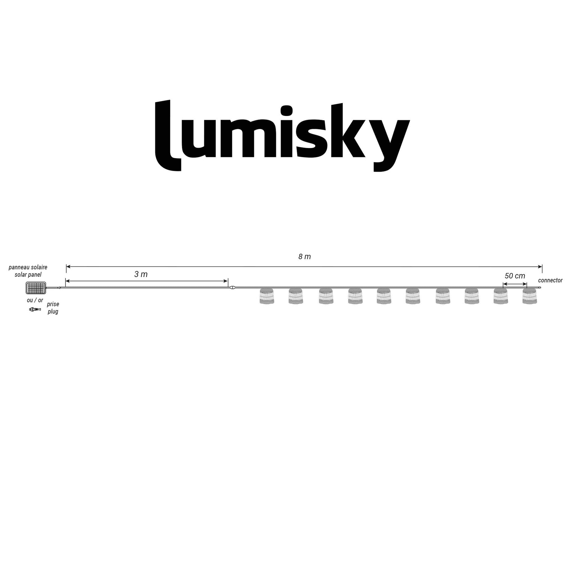 - Durabilité : Mesurant 8m de longueur totale avec 10 ampoules transparentes, la guirlande LED Samoa Light Hybrid est protégée contre les éclaboussures (IP44) et résistante aux UV. Avec un espacement de 50 cm entre chaque ampoule et 3 m entre la prise et la première ampoule, elle allie fonctionnalité et robustesse.