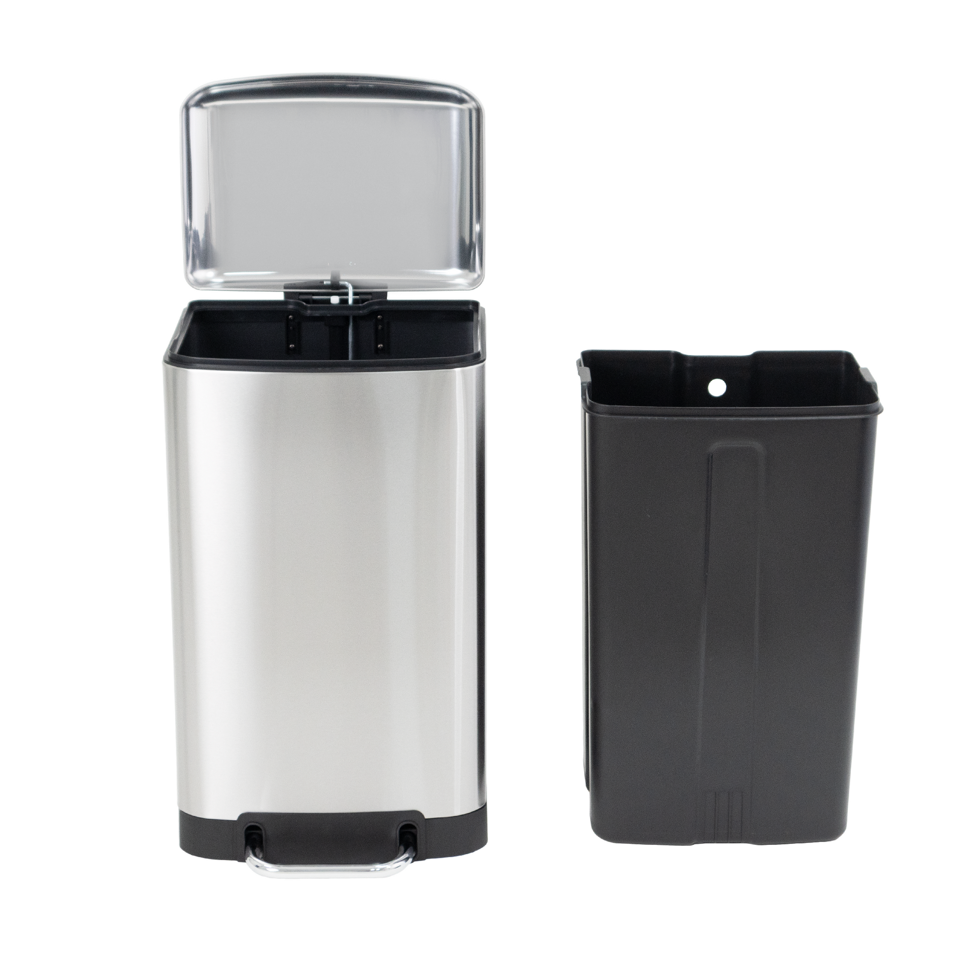 - Poubelle avec pédale au pied manuelle. Matériaux robustes. Mécanisme de pédale solide. Très simple d'utilisation. Fermeture insonore et anti-odeurs. Silencieuse grâce à son système d'amortisseur et de fermeture ralentie. Ouverture facile grâce à sa large pédale. Qualité professionnelle. Finition haut de gamme. Facile à déplacer grâce à une poignée de transport solide. Facile à nettoyer grâce au seau intérieur en plastique