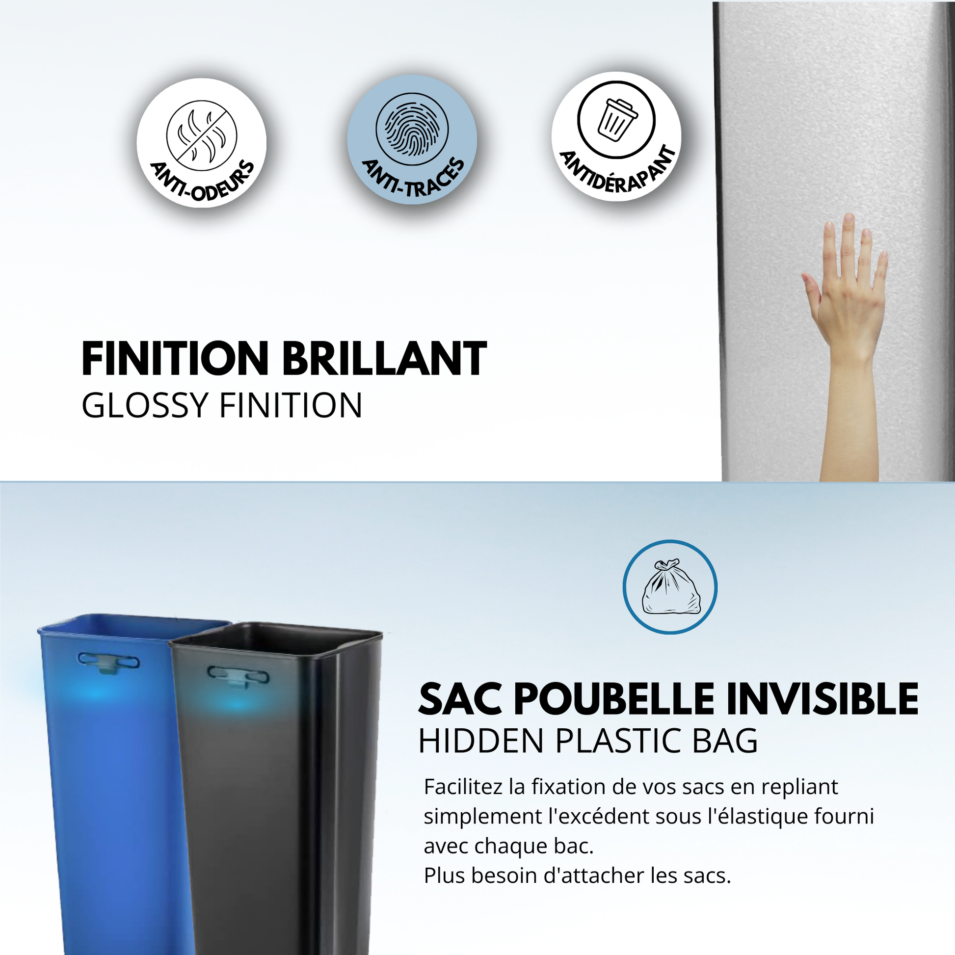Cette poubelle a tout pour plaire. Nul besoin de la cacher dans un coin : faites en un élément à part entière de votre déco. Idéal pour la cuisine, la salle de bain, le bureau, la chambre, la buanderie et tout autre endroit de passage où vous avez besoin d’une poubelle. Look moderne et élégant. -Apportez une touche d'élégance à votre cuisine avec la poubelle EDGE en acier inoxydable brossé. -Les matériaux lisses et non corrosifs de cette poubelle facilitent son entretien et en font un choix hygiénique pour la gestion de vos déchets. -Le système de fermeture douce et silencieuse avec amortisseur et fermeture ralentie rendent son utilisation pratique et agréable. -Le compartiment de 30L et le compartiment de 20L permettent un tri sélectif facile des différents types de déchets. -Inclus avec la poubelle, deux seaux en plastique pour maintenir votre sac poubelle en place et un bord de protection en plastique pour protéger les sols fragiles. -Cette poubelle est également très facile à déplacer