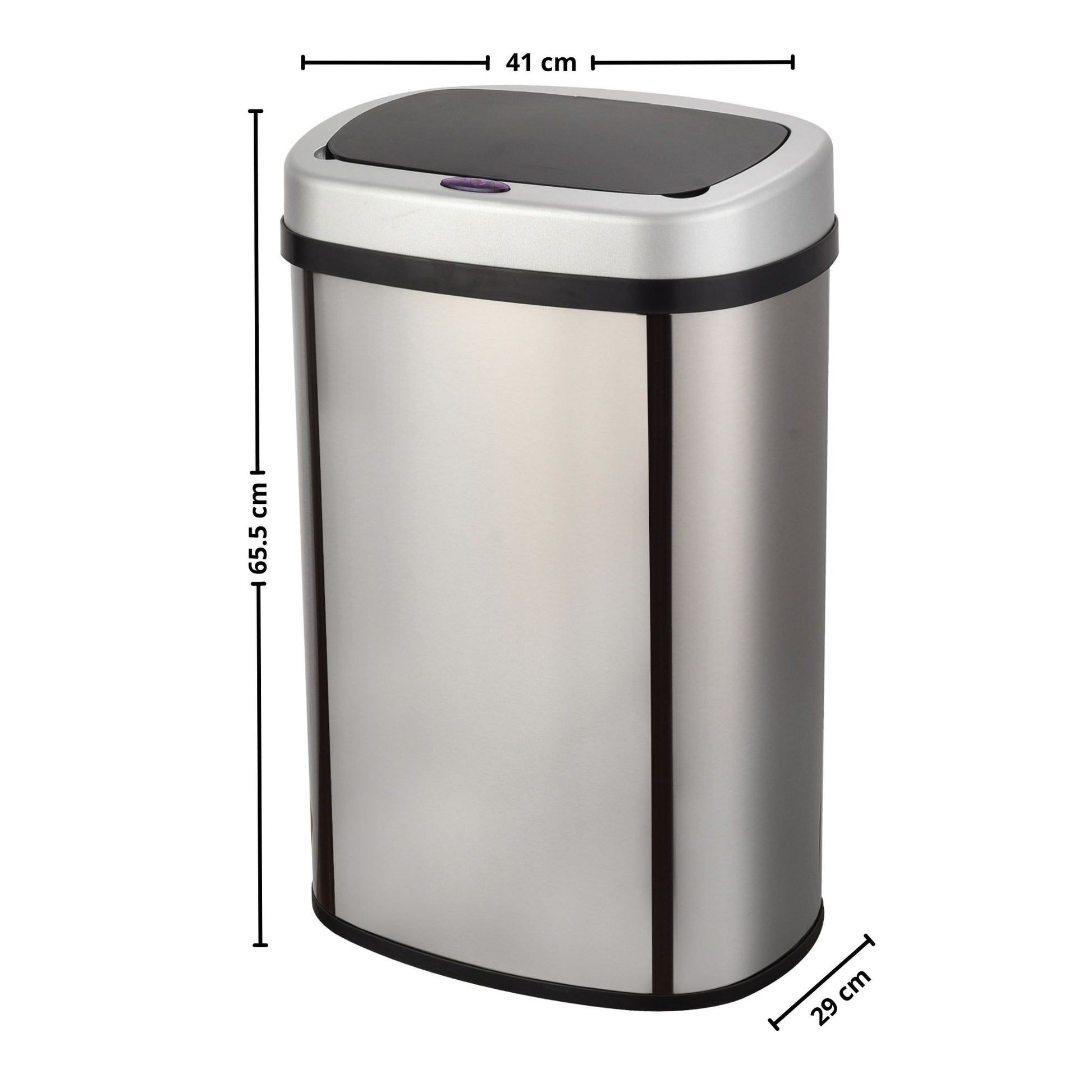 Poubelle de cuisine automatique rectangulaire avec cerclage Capacité 58L modèle MAJESTIC SILVERY en acier Inoxydable Finition inox brossé Dimension: 41x29xH65cm Poids:3,4kg . Avec témoin de batterie faible. Nouveau couvercle.