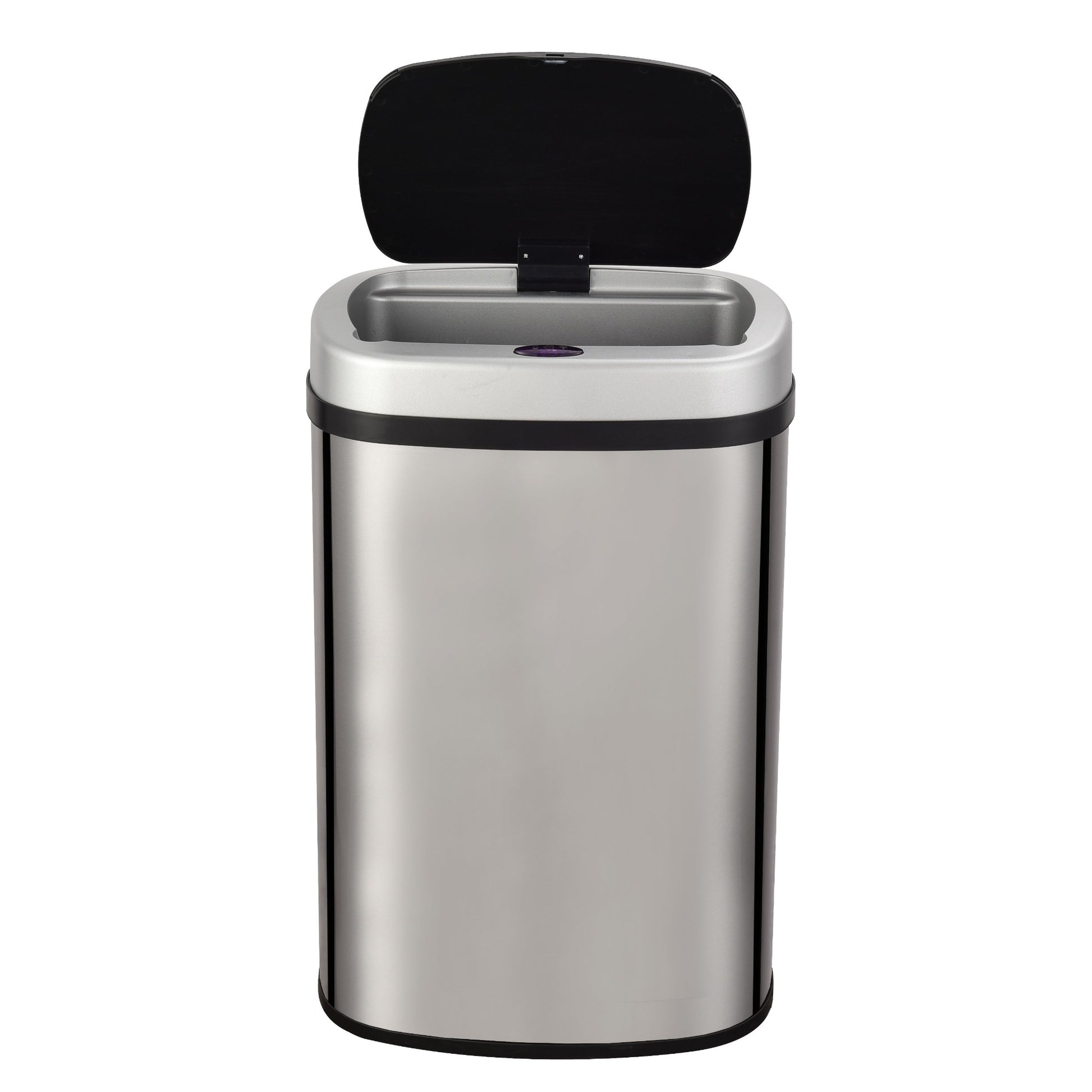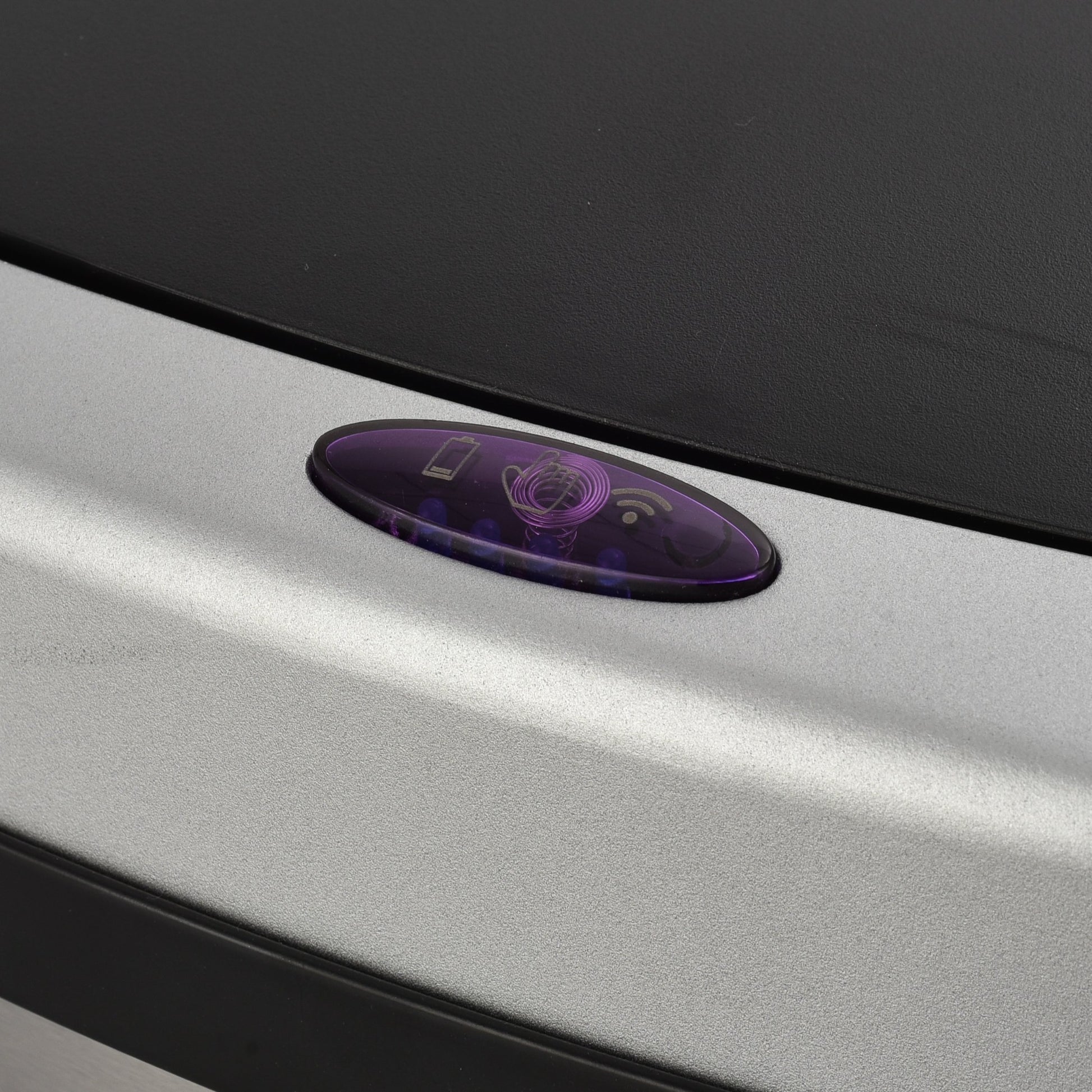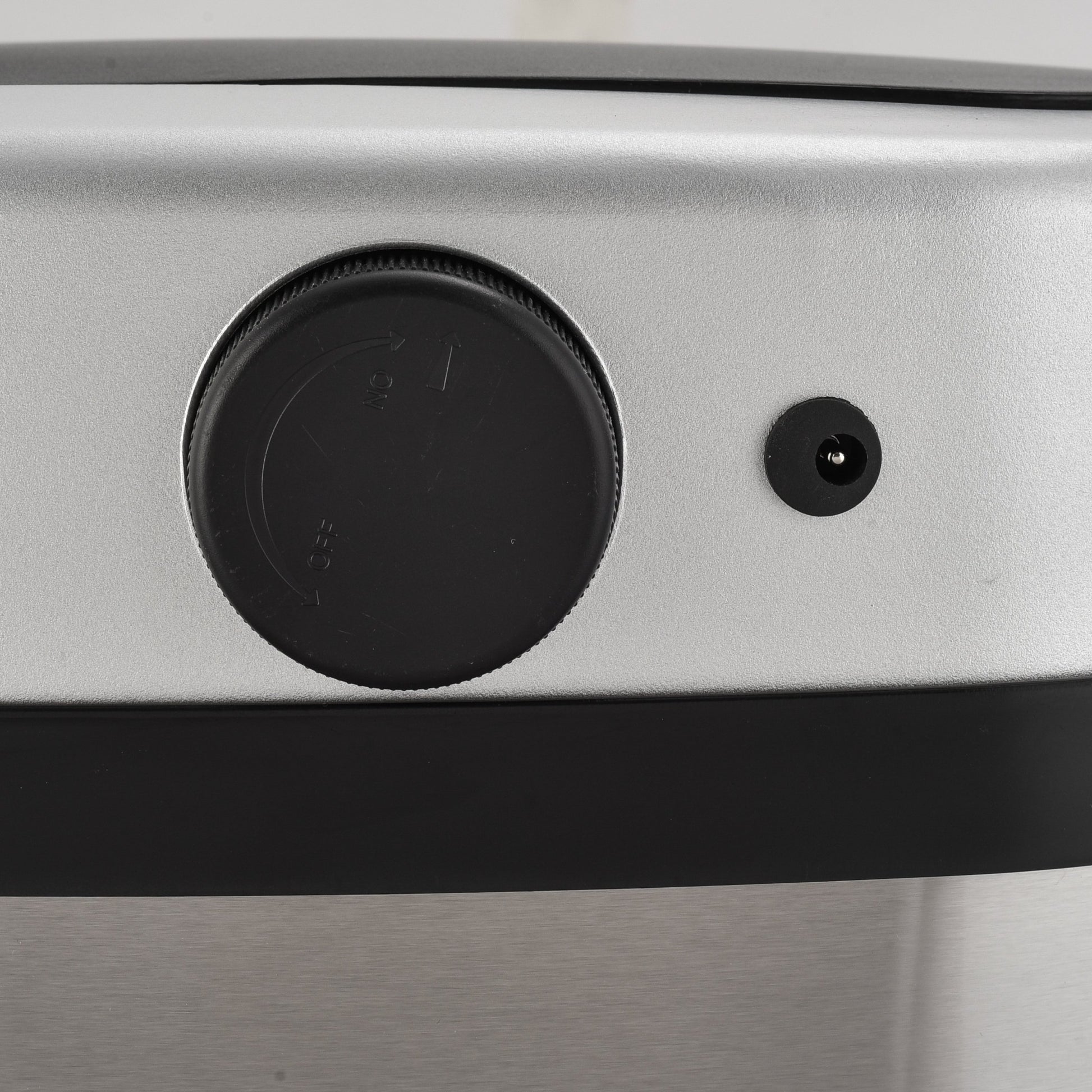 Corps en INOX (0.4mm) et couvercle en ABS. Fonctionne avec 4 piles LR06 (non fournies). Bouton ON/OFF (pour maintenir le couvercle ouvert). Inclus: Un cerclage plastique pour maintenir votre sac poubelle, et un anneau au sol pour la protection des sols fragiles.